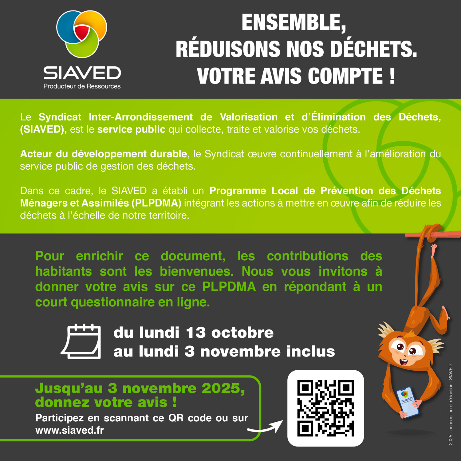 Dans le cadre de l’élaboration du Programme Local de Prévention des Déchets Ménagers et Assimilés (PLPDMA), le SIAVED a mis en ligne une consultation publique visant à recueillir l’avis des habitants et des acteurs du territoire.